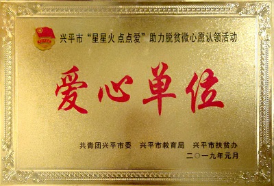 2019年1月,在兴平市“星星火,点点爱”助力脱贫微心愿认领活动中,华体(中国)漆被共青团兴平市委、兴平市教育局、兴平市扶贫办评为“爱心单位”