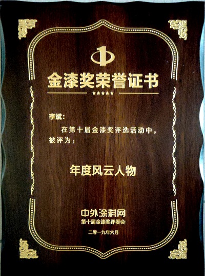 2019年6月,华体(中国)漆李斌同志在中外涂料网第十届金漆奖评选活动中被评为“年度风云人物”