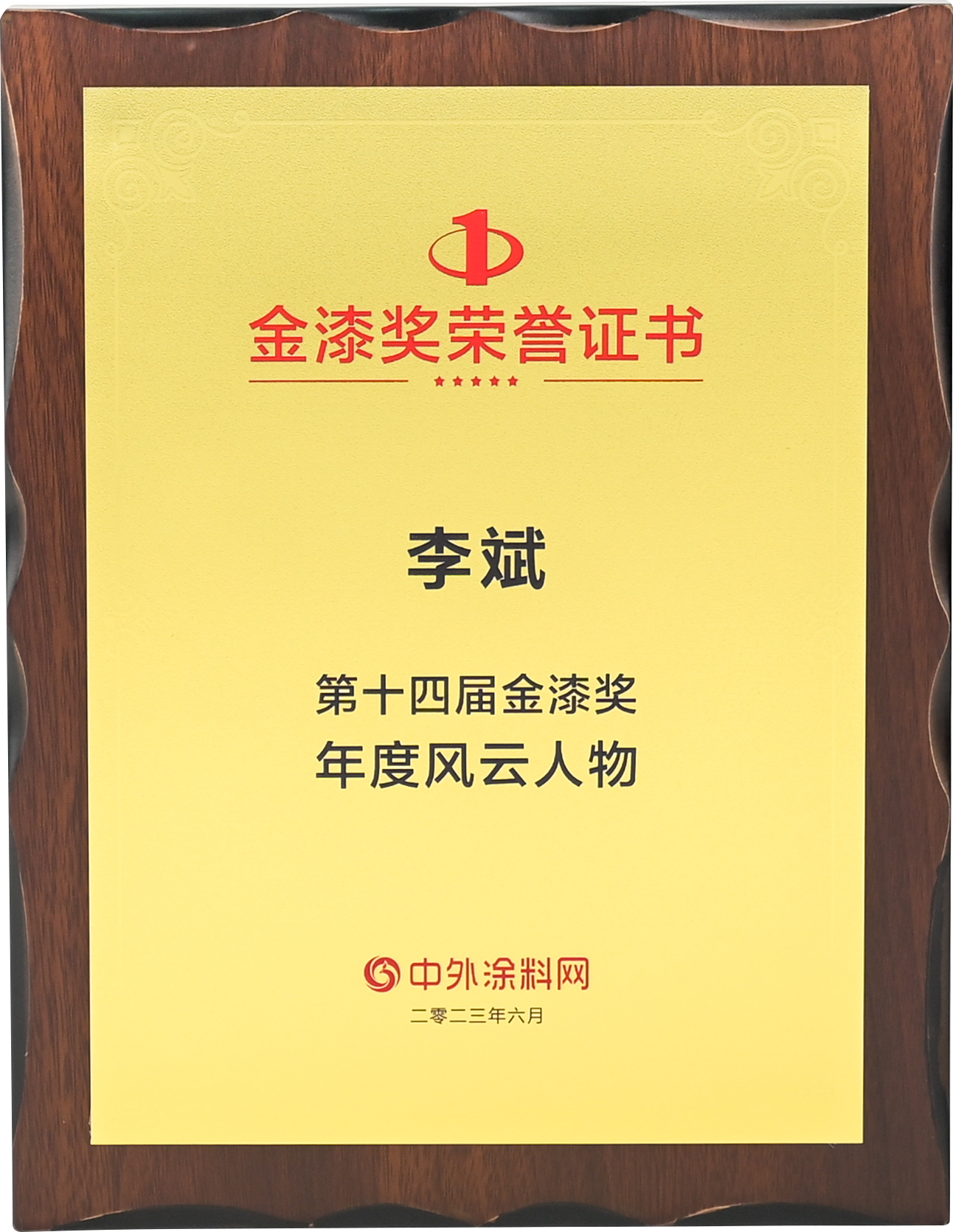2023年6月,华体(中国)漆李斌同志在中外涂料网第十四届金漆奖评选活动中被评为“年度风云人物”。